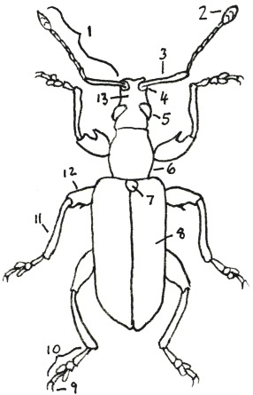 1 Antenna, 2 Club, 3 Scape, 4 Scrobe, 5 Compound eye, 6 Thorax, 7 Scutellum, 8 Elytron (pl elytra), 9 Claw, 10 Tarsus, 11 Tibia, 12 Femur (pl femora), 13 Rostrum