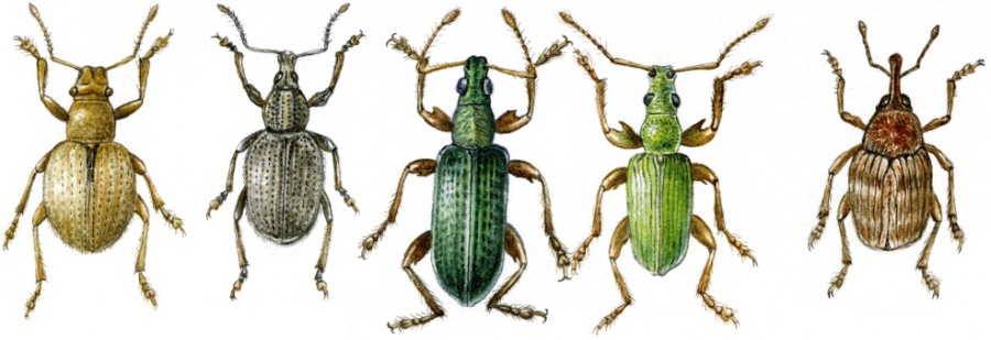 Left to right: Strophosomus melanogrammus, Otiorhynchus singularis, Phyllobius calcaratus, P. argentatus, Coeliodes ruber.